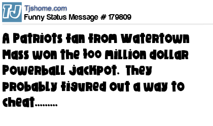 X says A Patriots fan from Watertown Mass won the 700 million dollar Powerball jackpot. They probably figured out a way to cheat.........