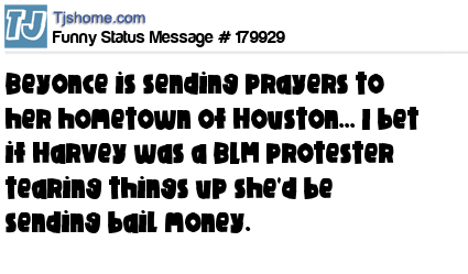 X Beyonce is sending prayers to her hometown of Houston... I bet if Harvey was a BLM protester tearing things up she'd be sending bail money.