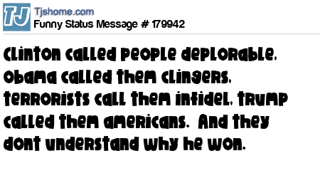 X says Clinton called people deplorable, obama called them clingers, terrorists call them infidel, trump called them americans. And they dont understand why he won.
