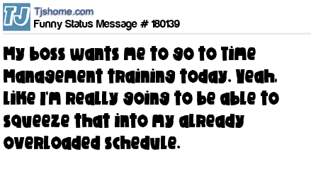 X says My boss wants me to go to Time Management training today. Yeah, like I'm really going to be able to squeeze that into my already overloaded schedule.