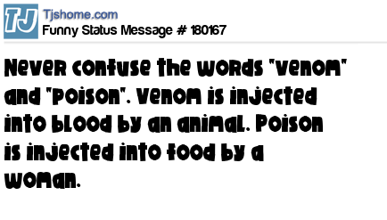X says Never confuse the words "venom" and "poison". Venom is injected into blood by an animal. Poison is injected into food by a woman.