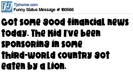 X is Got some good financial news today. The kid I've been sponsoring in some third-world country got eaten by a lion.