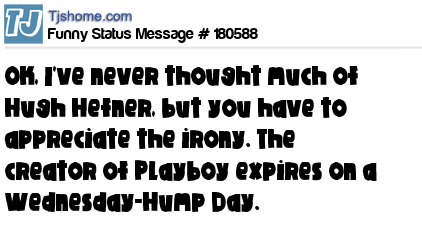 X is Ok, I've never thought much of Hugh Hefner, but you have to appreciate the irony. The creator of Playboy expires on a Wednesday-Hump Day.