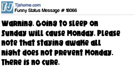 - # 34929 Warning: going to sleep on Sunday will cause Monday. Please note that staying awake all night does not prevent Monday. There is no cure.