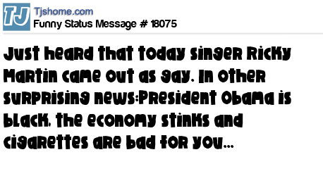 X just heard that today singer Ricky Martin came out as gay. In other surprising news:President Obama is black, the economy stinks and cigarettes are bad for you...
