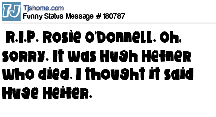 X says R.I.P. Rosie O'Donnell. Oh, sorry. It was Hugh Hefner who died. I thought it said Huge Heifer.