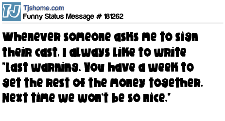 - # 139349 Whenever someone asks me to sign their cast, I always write: 'last warning, you have a week to get the money together.'