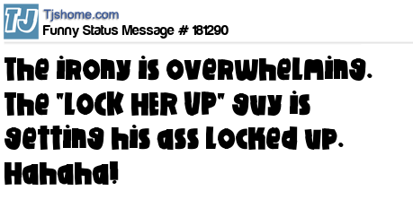 X is The irony is overwhelming. The "LOCK HER UP" guy is getting his ass locked up. Hahaha!