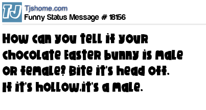 X How can you tell if your chocolate Easter bunny is male or female? Bite it's head off. If it's hollow,it's a male.