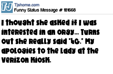 - # 116844 I thought she asked if I was interested in an orgy. Turns out she really said "4G." My apologies to the lady at the Verizon kiosk.