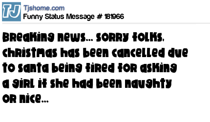 - # 181968 christmas has been cancelled this year due to santa being fired for inappropriate behavior by asking a girl if she had been naughty or nice...