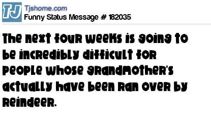 - # 162623 I can only assume the next 4 weeks are incredibly difficult for people who's grandmother's were actually run over by reindeer. ..