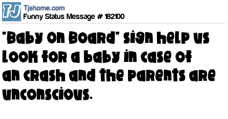 - # 59465 Every time I see a "Baby On Board" sign in a car window I wonder why in the hell the baby isn't in a car seat? Isn't a car seat safer than strapping your baby on a board and do you really want to advertise your lack of parenting skills?