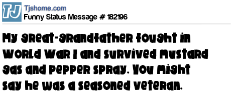 X says My great-grandfather fought in World War I and survived mustard gas and pepper spray. You might say he was a seasoned veteran.