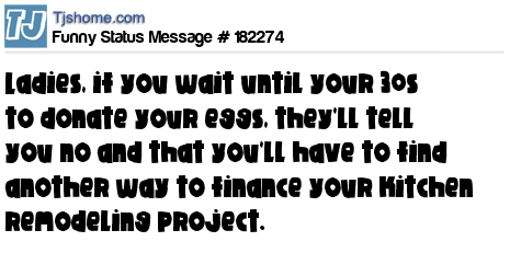 - # 173258 If you wait until your 30s to donate your eggs, they'll say no & tell you to find another way to finance your kitchen remodel.