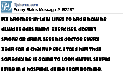 X says My brother-in-law likes to brag how he always eats right, exercises, doesn't smoke or drink, sees his doctor every year for a checkup etc. I told him that someday he is going to look awful stupid lying in a hospital dying from nothing.