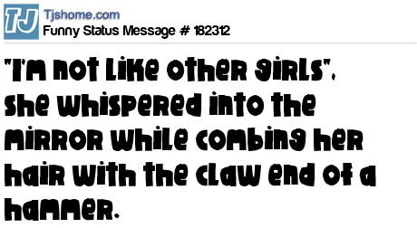 X says "I'm not like other girls", she whispered into the mirror while combing her hair with the claw end of a hammer.