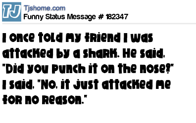 X says I once told my friend I was attacked by a shark. He said, "Did you punch it on the nose?" I said, "No, it just attacked me for no reason."
