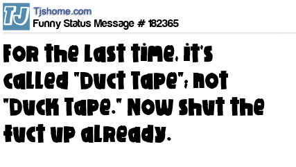X says For the last time, it's called "Duct Tape"; not "Duck Tape." Now shut the fuct up already.
