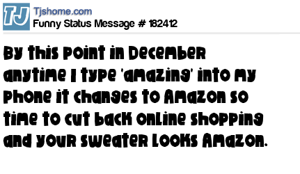 X says By this point in December anytime I type 'amazing' into my phone it changes to Amazon so time to cut back online shopping and your sweater looks Amazon.