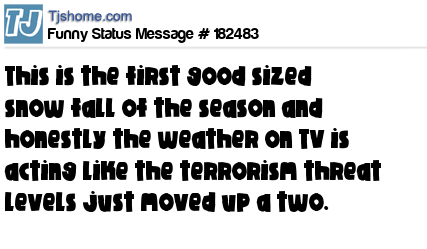 - # 86586 First big snow fall of the season and the TV news is acting like the terrorism threat levels just moved up a spot or two.