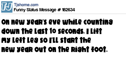 - # 190962 On new year's eve, tonight while counting down the last 10 seconds, Lift yout left leg so you start the new year out on the right foot, making all your troubles last as long as your New Year's resolutions! Happy new years guys! Be safe, please. 😘