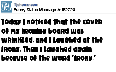 - # 186451 When I was in our laundry room today, I saw that our ironing board cover was wrinkled. I laughed at the irony. Then I laughed again because irony has the word iron in it.