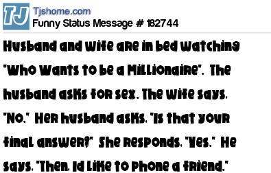 - # 85694 husband and wife are in bed watching "Who Wants to be a Millionaire". The husband asks for sex. The wife says, "No." > Her husband asks, "Is that your final answer?" > She responds, "Yes." He says, "Then, Id like to call a friend."