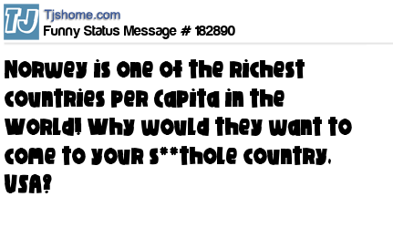 X says Norwey is one of the richest countries per Capita in the World! Why would they want to come to your s**thole country, USA?