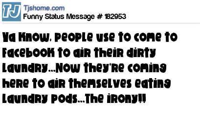 X is Ya know, people use to come to Facebook to air their dirty laundry...Now they're coming here to air themselves eating laundry pods...The irony!!