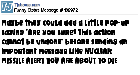 X says Maybe they could add a little pop-up saying "Are you sure? This action cannot be undone" before sending an important message like NUCLEAR MISSILE ALERT YOU ARE ABOUT TO DIE