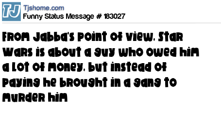 X says From Jabba's point of view, Star Wars is about a guy who owed him a lot of money, but instead of paying he brought in a gang to murder him