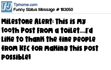 X says Milestone Alert: This is my 100th Post From a toilet....I'd like to thank the fine people from KFC for making this post possible!