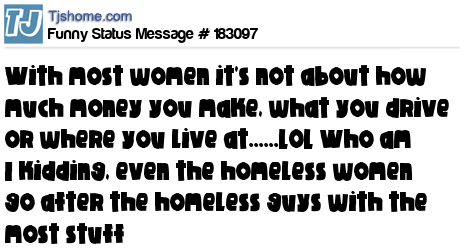 - # 122245 With women it's not about how much money you make, what you drive or where you live at... LOL Who am I kidding, even the homeless women go after the homeless guys with the most stuff..