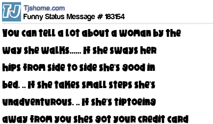 - # 122396 You can tell a lot about a woman by the way she walks. .. If she sways her hips from side to side she's good in bed. .. If she takes small steps she's unadventurous. .. If she's tiptoeing away from you shes got your credit card.