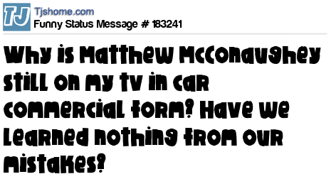 X says Why is Matthew McConaughey still on my tv in car commercial form? Have we learned nothing from our mistakes?