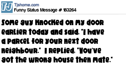 - # 123916 Some guy knocked on my door today and said, "I have a parcel for your next door neighbour." I said, "You've got the wrong house then man."