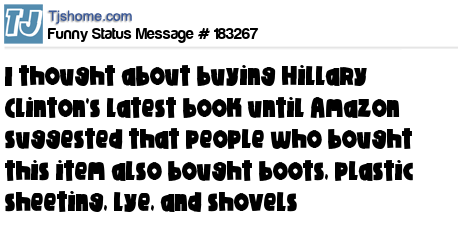 X says I thought about buying Hillary Clinton's latest book until Amazon suggested that people who bought this item also bought boots, plastic sheeting, lye, and shovels