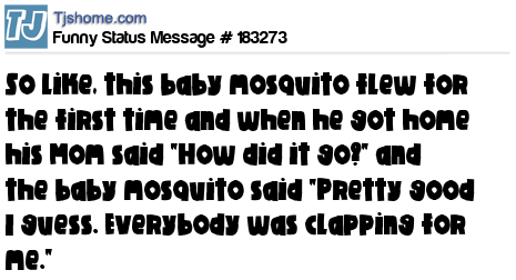 X says So like, this baby mosquito flew for the first time and when he got home his Mom said "How did it go?" and the baby mosquito said "Pretty good I guess. Everybody was clapping for me."