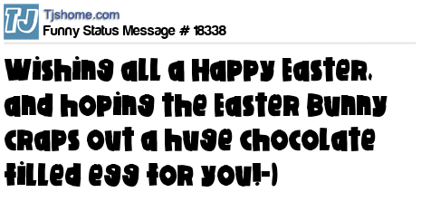 X is Wishing all a Happy Easter, and hoping the Easter Bunny craps out a huge chocolate filled egg for you!-)