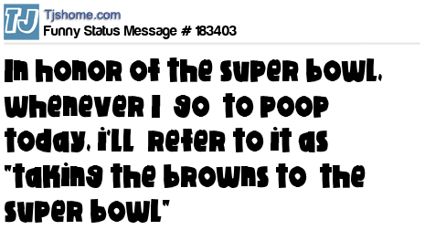 X says In honor of the super bowl, whenever I go to poop today, i'll refer to it as "taking the browns to the super bowl"