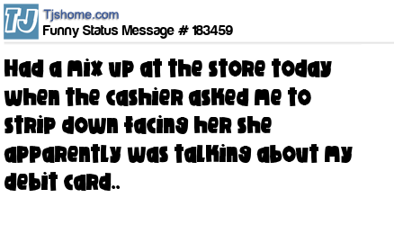 - # 152272 Had a big mix up at the store today... Apparently, when the woman said "strip down facing me," she was referring to my credit card.