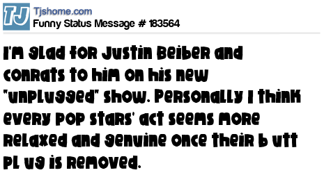 X I'm glad for Justin Beiber and conrats to him on his new "unplugged" show. Personally I think every pop stars' act seems more relaxed and genuine once their b utt pl ug is removed.