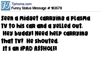X is Seen a midget carrying a plasma TV to his car and a yelled out, “Hey buddy! Need help carrying that TV?” He shouted, “It’s an iPAD A$$HOLE!”