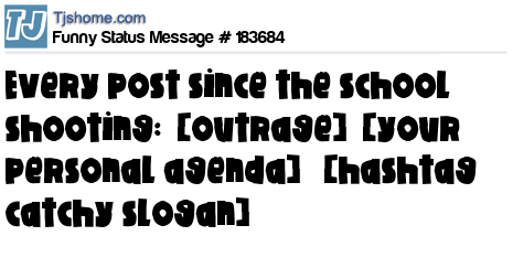 X says Every post since the school shooting: [outrage] [your personal agenda] [hashtag catchy slogan]
