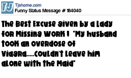 X says The Best Excuse given by a Lady for Missing Work !  "My husband took an overdose of Viagra.....Couldn't leave him alone with the Maid"