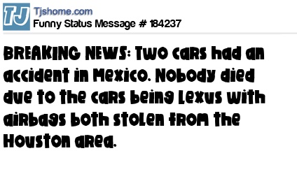 X says BREAKING NEWS: Two cars had an accident in Mexico. Nobody died due to the cars being Lexus with airbags both stolen from the Houston area.