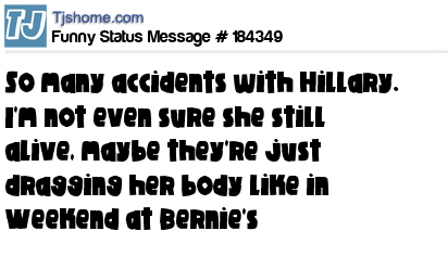 X So many accidents with Hillary. I'm not even sure she still alive, maybe they're just dragging her body like in Weekend at Bernie's
