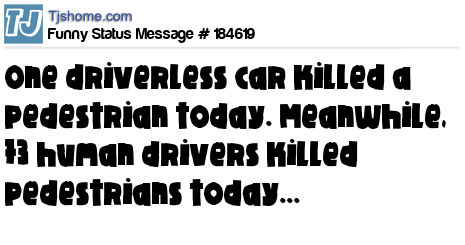 X  One driverless car killed a pedestrian today. Meanwhile, 73 human drivers killed pedestrians today...