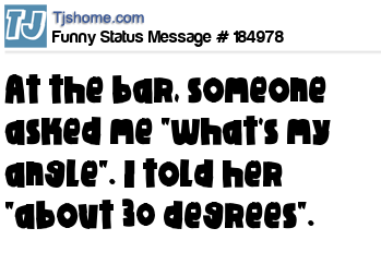 X is At the bar, someone asked me "what's my angle". I told her "about 30 degrees".